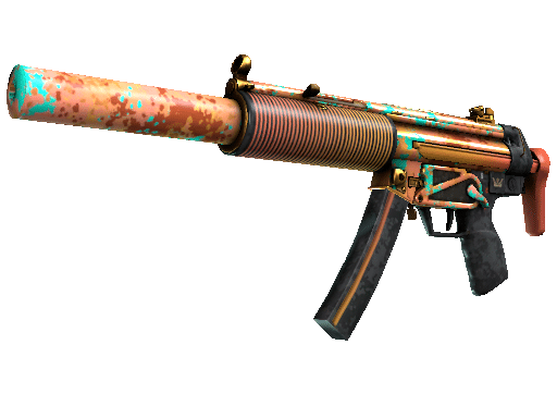 Often imitated but never equaled, the iconic MP5 is perhaps the most versatile and popular SMG in the world. This SD variant features an integrated silencer, making an already formidable weapon whisper-quiet. A brightly-colored orange and teal camouflage pattern has been applied. The weapon has been finished with gold accents.